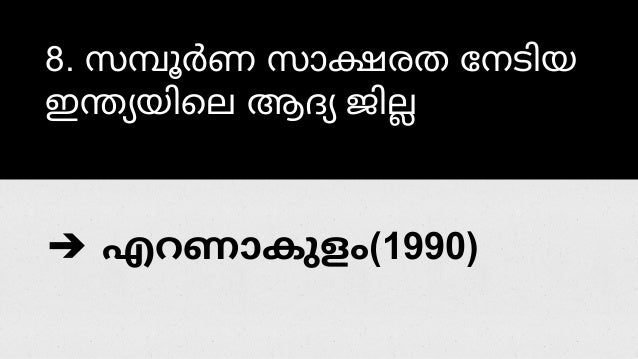 - 10. ➔ എറണാകുളം(1990) 8. സമ്പൂർണ സാക്ഷരത േനടിയ ഇന്ത്യയിെല ആദ്യ ജില്ല