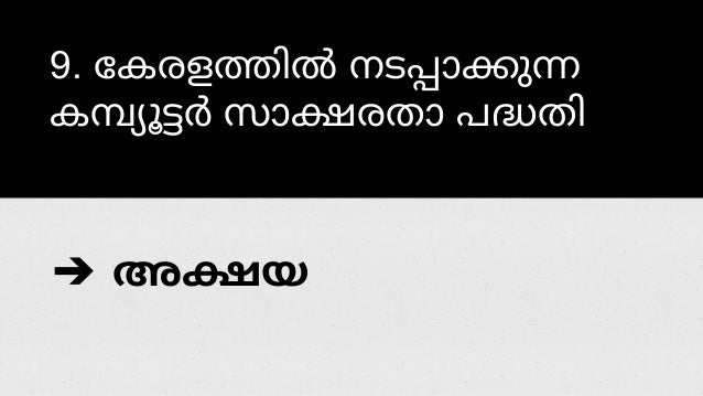 - 11. ➔ അക്ഷയ 9. േകരളത്തിൽ നടപ്പാക്കുന്ന കമ്പ്യൂട്ടർ സാക്ഷരതാ പദ്ധതി