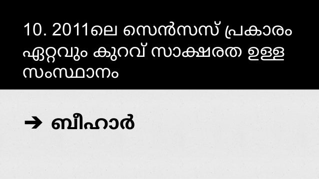 - 12. ➔ ബീഹാർ 10. 2011െല െസൻസസ് പകാരം ഏറ്റവും കുറവ് സാക്ഷരത ഉള്ള സംസ്ഥാനം