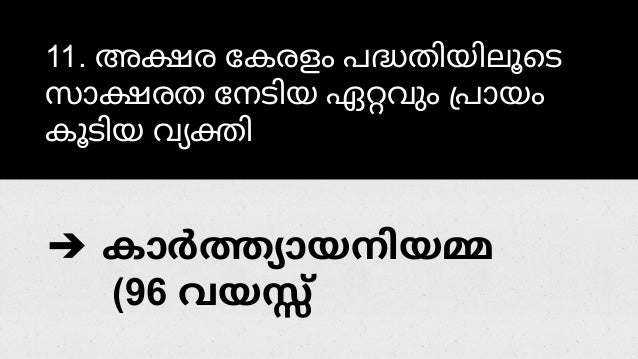 - 13. ➔ കാർത്ത്യായനിയമ്മ (96 വയസ്സ് 11. അക്ഷര േകരളം പദ്ധതിയിലൂെട സാക്ഷരത േനടിയ ഏറ്റവും പായം കൂടിയ വ്യക്തി