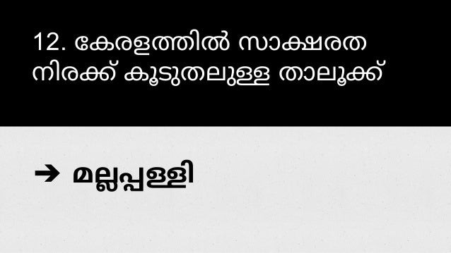 - 14. ➔ മല്ലപ്പള്ളി 12. േകരളത്തിൽ സാക്ഷരത നിരക്ക് കൂടുതലുള്ള താലൂക്ക്