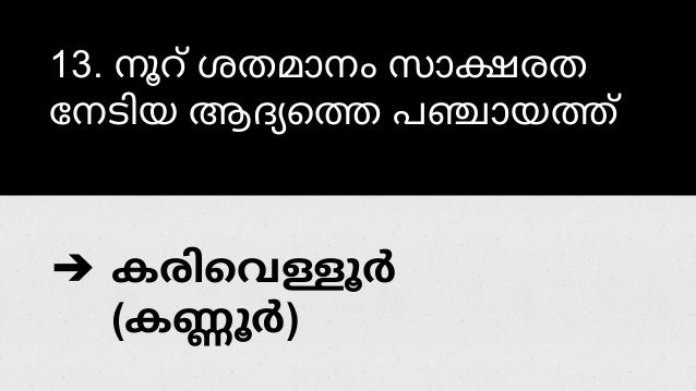 - 15. ➔ കരിെവള്ളൂർ (കണ്ണൂർ) 13. നൂറ് ശതമാനം സാക്ഷരത േനടിയ ആദ്യെത്ത പഞ്ചായത്ത്
