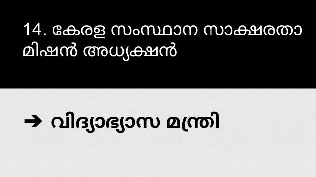 - 16. ➔ വിദ്യാഭ്യാസ മ ന്ത്രി 14. േകരള സംസ്ഥാന സാക്ഷരതാ മിഷൻ അധ്യക്ഷൻ