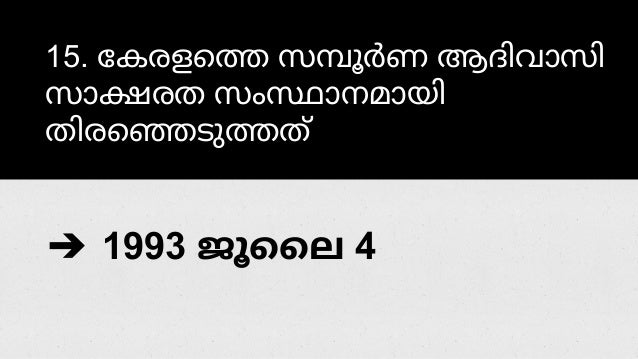 - 17. ➔ 1993 ജൂൈല 4 15. േകരളെത്ത സമ്പൂർണ ആദിവാസി സാക്ഷരത സംസ്ഥാനമായി തിരെഞ്ഞെടുത്തത്