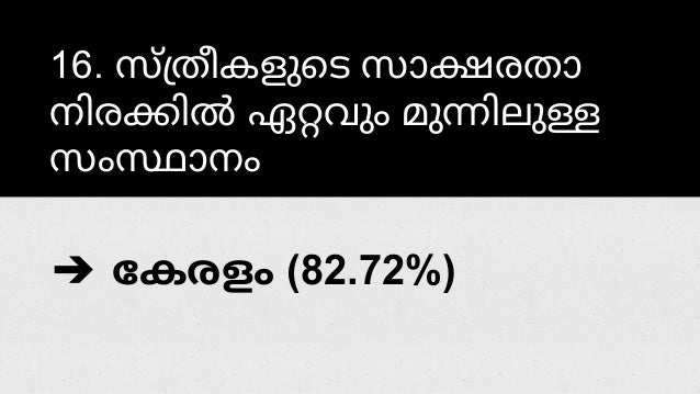 - 18. ➔ േകരളം (82.72%) 16. സ് തീകളുെട സാക്ഷരതാ നിരക്കിൽ ഏറ്റവും മുന്നിലുള്ള സംസ്ഥാനം