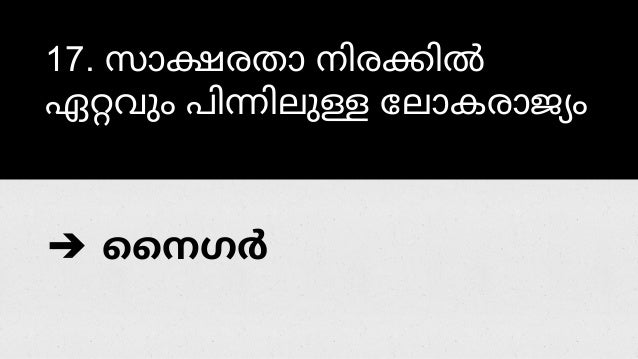 - 19. ➔ ൈനഗർ 17. സാക്ഷരതാ നിരക്കിൽ ഏറ്റവും പിന്നിലുള്ള േലാകരാജ്യം