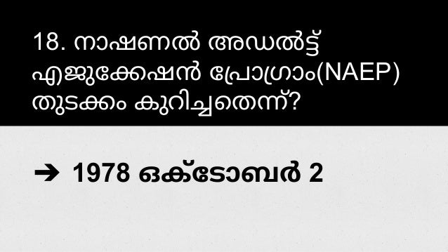 - 20. ➔ 1978 ഒക്േടാബർ 2 18. നാഷണൽ അഡൽട്ട് എജുേക്കഷൻ േ പാ ഗാം(NAEP) തുടക്കം കുറിച്ചെതന്ന്?
