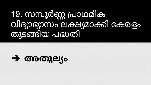 - 21. ➔ അതുല്യം 19. സമ്പൂർണ്ണ പാഥമിക വിദ്യാഭ്യാസം ലക്ഷ്യമാക്കി േകരളം തുടങ്ങിയ പദ്ധതി