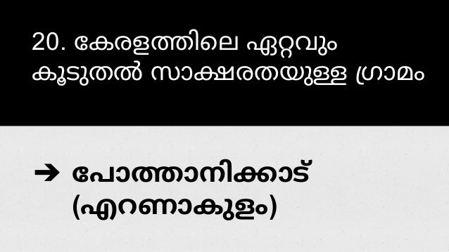 - 22. ➔ േപാത്താനിക്കാട് (എറണാകുളം) 20. േകരളത്തിെല ഏറ്റവും കൂടുതൽ സാക്ഷരതയുള്ള ഗാമം