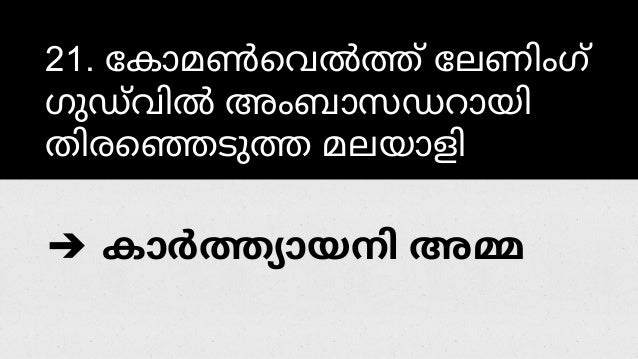 - 23. ➔ കാർത്ത്യായനി അമ്മ 21. േകാമൺെവൽത്ത് േലണിംഗ് ഗുഡ്വിൽ അംബാസഡറായി തിരെഞ്ഞെടുത്ത മലയാളി
