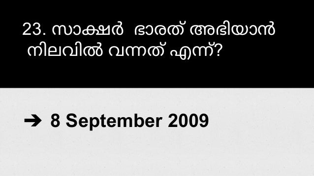 - 25. ➔ 8 September 2009 23. സാക്ഷർ ഭാരത് അഭിയാൻ നിലവിൽ വന്നത് എന്ന്?