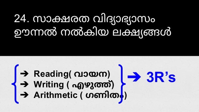- 26. ➔ Reading( വായന) ➔ Writing ( എഴുത്ത്) ➔ Arithmetic ( ഗണിതം) 24. സാക്ഷരത വിദ്യാഭ്യാസം ഊന്നൽ നൽകിയ ലക്ഷ്യങ്ങൾ ➔ 3R’s