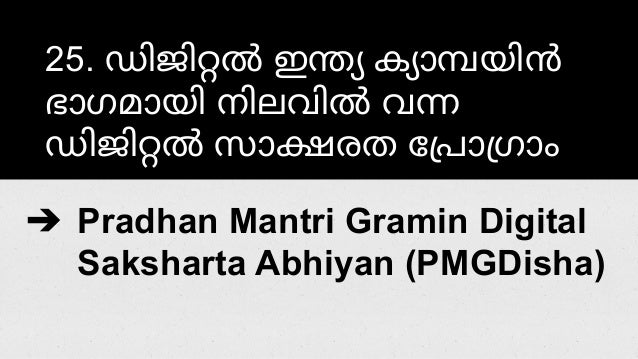 - 27. ➔ Pradhan Mantri Gramin Digital Saksharta Abhiyan (PMGDisha) 25. ഡിജിറ്റൽ ഇന്ത്യ ക്യാമ്പയിൻ ഭാഗമായി നിലവിൽ വന്ന ഡിജിറ്റൽ സാക്ഷരത േ പാ ഗാം