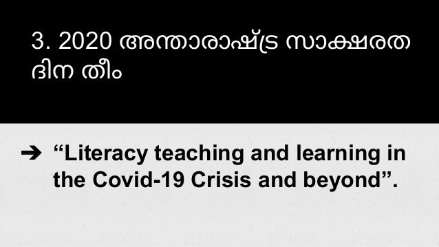 - 4. ➔ “Literacy teaching and learning in the Covid-19 Crisis and beyond”. 3. 2020 അന്താരാഷ് ട സാക്ഷരത ദിന തീം