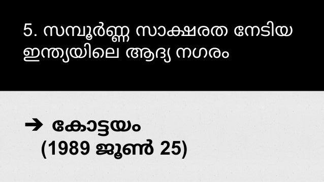 - 6. ➔ േകാട്ടയം (1989 ജൂൺ 25) 5. സമ്പൂർണ്ണ സാക്ഷരത േനടിയ ഇന്ത്യയിെല ആദ്യ നഗരം