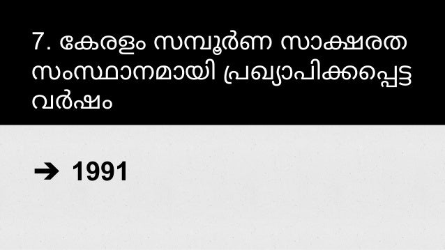 - 9. ➔ 1991 7. േകരളം സമ്പൂർണ സാക്ഷരത സംസ്ഥാനമായി പഖ്യാപിക്കെപ്പട്ട വർഷം
